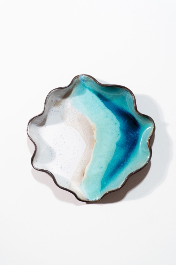 The shape, inspired by oyster shells and the movement of waves, evokes a fragment of the seabed shaped by water and sand. Its irregular outline and soft curves make each bowl appear as if drawn from the ocean depths.